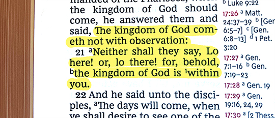The kingdom of God comes not with observation: neither shall they say, lo here! or, lo there! for, behold the kingdom of God is within you. —Luke 17:20-21
